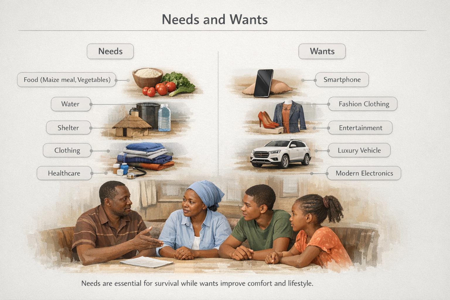 Wants are desires for goods and services that improve comfort or lifestyle but are not essential for survival.
