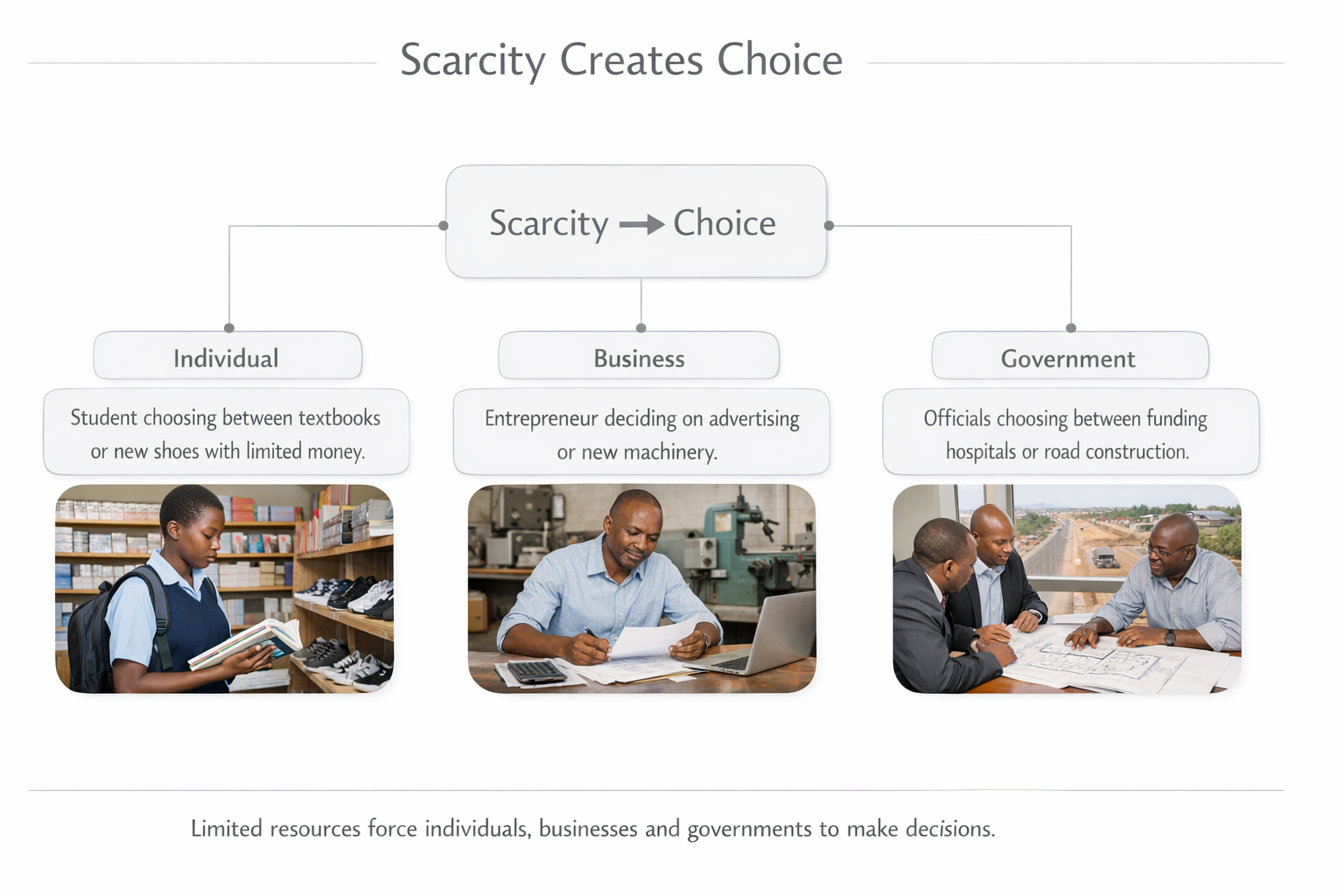 Because of scarcity, individuals, businesses and governments must make choices.