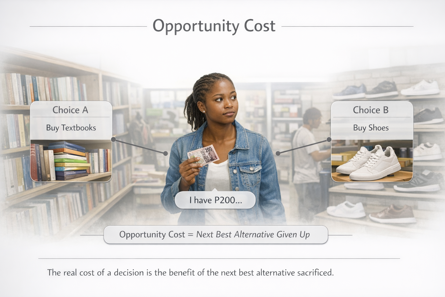 A student with P200 must choose between buying textbooks or new shoes.