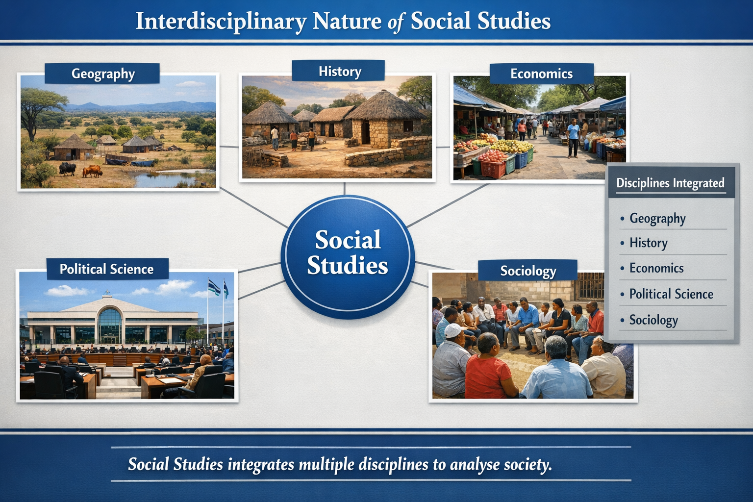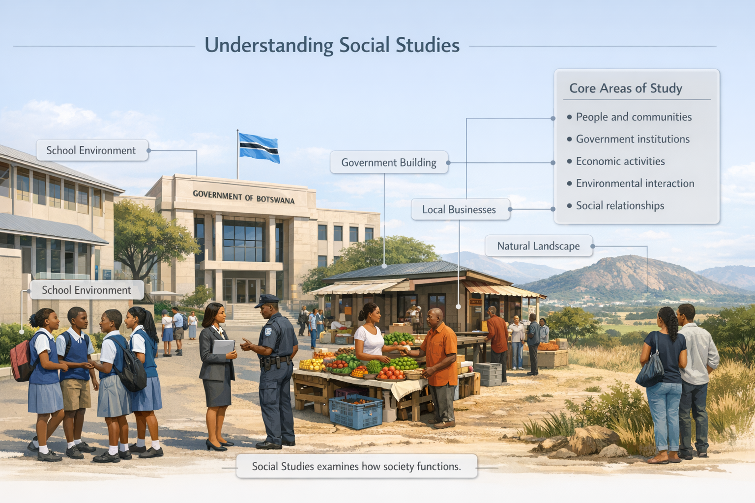 This lesson introduces the meaning, characteristics and importance of Social Studies as a subject. It explains what Social Studies studies, how it is structured, and why it is significant in Botswana.